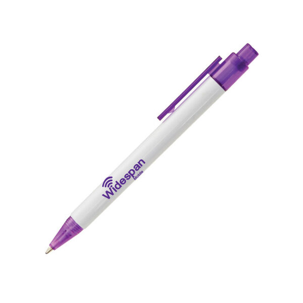 Bestselling budget-friendly plastic pen. Available in white with coloured trim or frosted colour options. Black ink.